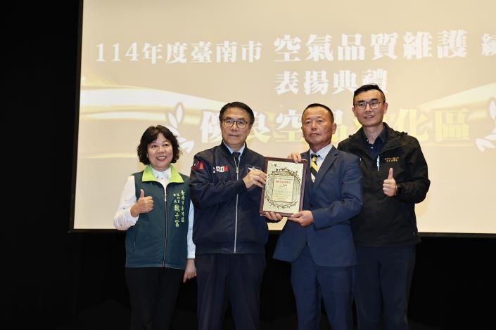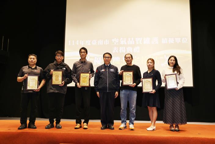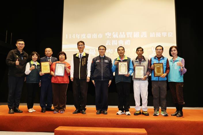 為維護市民優質生活環境,台南市政府攜手民間單位戮力推動空氣品質優化,今(15)日於臺南市美術館二館舉行「114 年度臺南市空氣品質維護績優單位表揚典禮」,由市長黃偉哲親自表揚,並感謝38個獲獎單位的努力及卓越表現,推升台南空品。獲獎者橫跨營建、交通、企業、校園到社區等多領域,立委林俊憲辦公室也派代表出席表達支持。