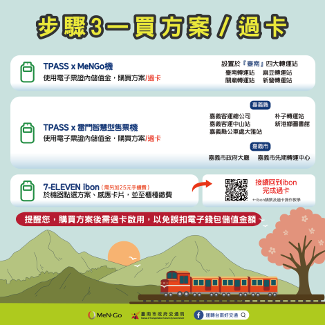 再次提醒,完成購買方案後需到7-11ibon、台鐵窗口、TPASSxMeNGo機或使用iPASS MONEY APP過卡啟用,以免誤扣電子錢包儲值金額。