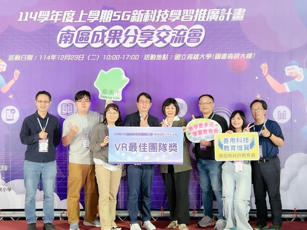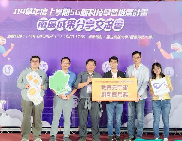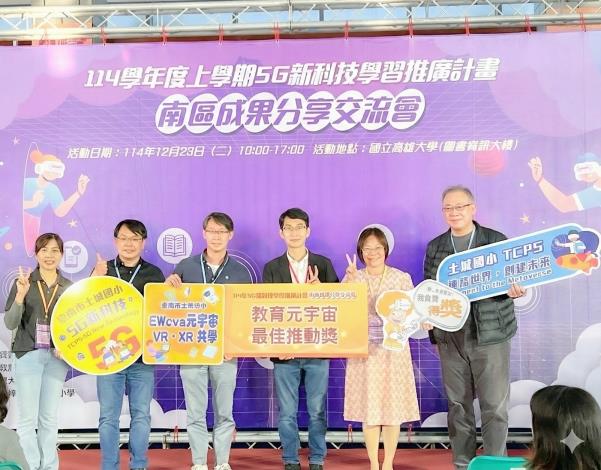臺南市多年來持續推動5G與新科技融入教學,並鼓勵各校參與教育部5G新科技計畫打造沉浸式、多元化的學習環境,本年度計有教育元宇宙推廣計畫學校土城國小、重溪國小、崇明國小等3校及VR融入教學推廣計畫學校仙草實小、竹門國小、河東國小、長安國小及仁德國中等5校共8校獲選為114年學年度上學期5G新科技學習推廣計畫學校,教育部日前於國立高雄大學舉辦114年學年度上學期5G新科技學習推廣計畫南區成果交流會,來自11縣市51個計畫學校齊聚一堂進行教學成果展示與交流,南市8所5G新科技計畫學校無論在課程設計、教學創新及學習成效上表現亮眼,全數獲獎,展現深耕新科技教育的豐碩成果。