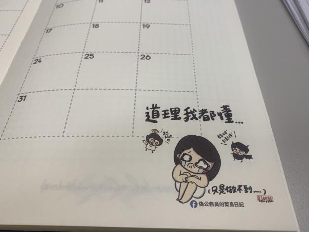 值得一提的是,手冊中與臉書知名粉絲團「偽公務員的菜鳥日記」合作,每月搭配一張描繪基層公務員日常生活的幽默插圖,不但風格溫暖,貼近職場經驗的內容,更讓公務員看了大呼有感。