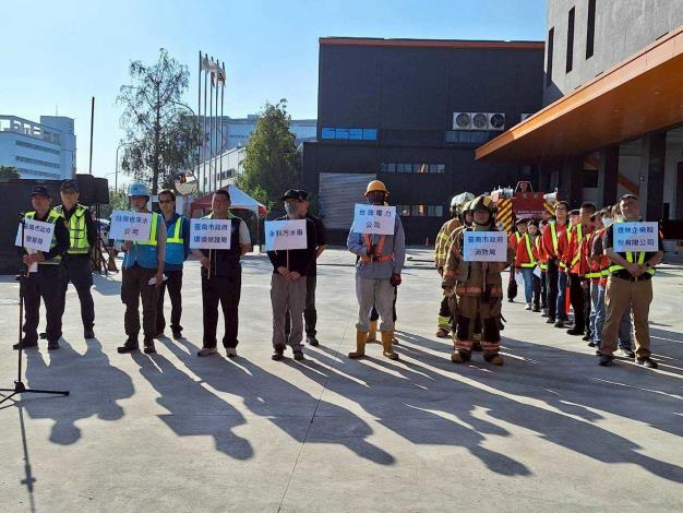 市府經發局張婷媛局長亦表示,臺南市工業區共81處,其中局內轄管產業園區包含樹谷園區、永康科技、柳營科技、新吉及七股科技工業區5處,各工業區工作環境有各式各樣潛在風險;藉由本次聯合演練,可有效建立廠區人員之危害預防與應變觀念、知識及技能,透過實際狀況演練訓練模式,可使參加人員相互學習交流及吸收相關資訊,並從中學習作業安全技能及意外發生之應變處理能力,藉此強化工業區各事業單位防災意識,同時將逐步推廣各園區建立年度災害演練機制及橫向聯繫窗口清冊建立,以落實防災避險機制,爾後亦持續加強各產業園區包含火災、地震、氣體管線、暴雨等各面向的防災演練。
