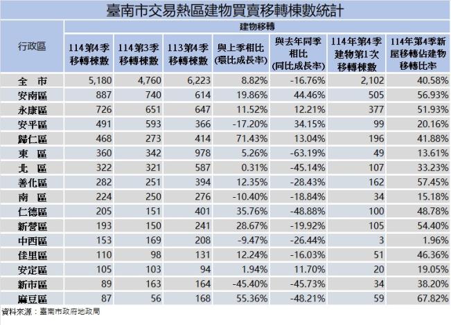 臺南市不動產交易114年第4季土地與建物買賣移轉統計資料出爐,本季土地買賣筆數為9,903筆,與前季相比,增幅為8.96%,而與113年第4季相較,減幅達23.81%。本季建物買賣棟數為5,180棟,較上季增加8.82%,與113年第4季相比衰退16.76%;其中,建物辦竣第一次登記後移轉棟數為2,102棟,占建物總移轉比例40.58%。觀察臺南市114年第4季不動產交易情形,土地及建物買賣移轉量相較於前一季均呈現回溫,惟與113年同期相比,整體交易量仍明顯下滑,顯示市場短期交易回溫,但中長期仍受景氣及政策因素影響。後續市場發展,仍受整體經濟情勢、金融貸款政策及購屋者信心之影響。