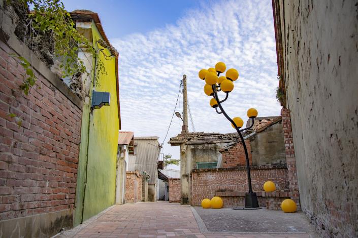 而擅長雕塑和空間裝置的藝術家石孟鑫,常以生活物件拼裝、變形,活用畸零空間,讓物件和空間產生對話。石孟鑫說,這次在魚鱗巷展出《路燈樹》,靈感來自鹽水早年倒風內海的潮汐與風勢,讓許多路樹在歲月中傾斜生長。作品將臺灣家戶常見的黃色門柱燈變形,模擬路樹傾斜生長的姿態,從街角的空隙中伸展,像是在訴說一段被海風推動過的身體記憶。小型的黃球燈則從牆面縫隙與殘痕中生長出來,像是光的果實,在夜間用柔和的光暈染魚鱗巷,讓老巷弄更加迷人。