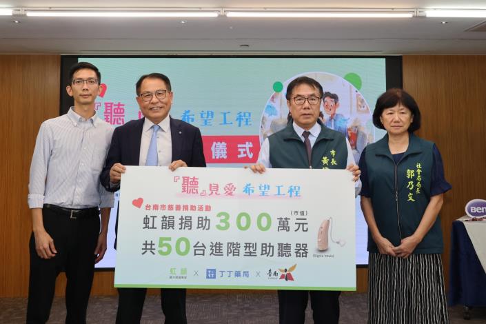 虹韻國際貿易股份有限公司(虹韻助聽器)及諾貝兒寶貝股份有限公司(丁丁藥局)有感於聽力對於聽障者的重要性,慨捐每部約6萬元的進階版助聽器50部予台南市政府,總價約達3百萬。今(7)日於永華市政中心舉行捐贈儀式,由市長黃偉哲代表接受捐贈並回贈感謝狀,他誠摯感謝企業的善行義舉,協助弱勢擁有基本人權「聽力」。
