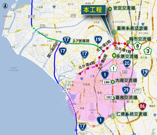 工務局表示,臺南都會區北外環快速道路可有效紓解進出國道系統之車流,並移轉國道1號永康交流道暨其連絡道台1線之交通負荷,故配合北外環道路之興建,於該道路與國道1號交會處(約317K+600處)增設1處交流道,以加強國道可及性及通往南科之便捷性。