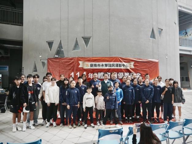 臺南市永華國民運動中心委外營運廠商喬鑫股份有限公司於今日(12月20日)辦理「114年度體育績優獎學金」頒獎典禮,共計有63位來自各級學校之優秀選手獲獎。體育局陳良乾局長特別代表黃偉哲市長到場致意,並頒獎肯定獲獎選手在運動競技與平日訓練上的傑出表現,並讚許私人企業持續回饋基層體育發展的義舉。