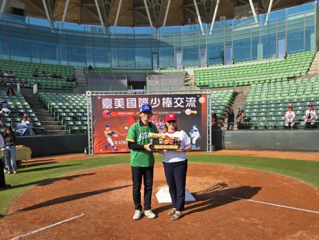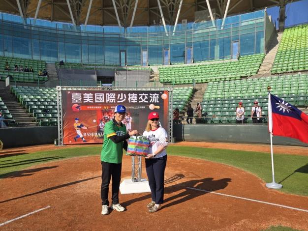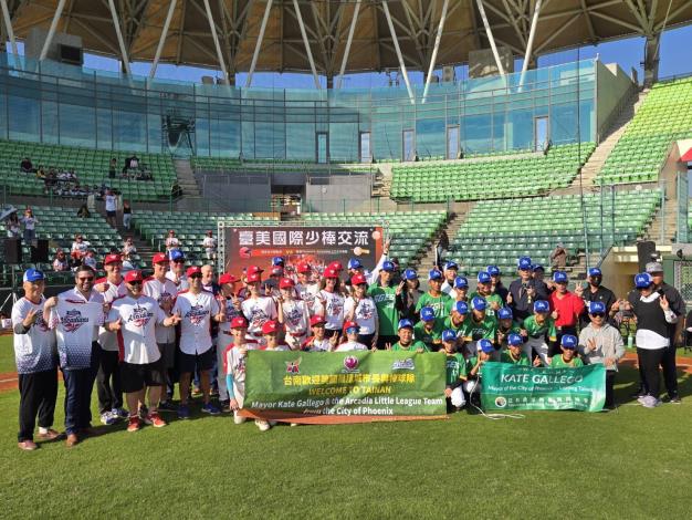 臺南市政府持續推動三級棒球國際交流政策,期望藉由棒球國際交流,提升本市棒球競技實力。今(11)日由美國鳳凰城市長Kate Gallego 帶領 Phoenix Arcadia U12 少棒隊遠道而來,與臺南市少棒聯隊(省躬國小、億載國小、新進國小、協進國小、安慶國小、永信國小)進行國際交流賽,臺南市少棒聯隊也特別致贈茄芷袋、鑰匙圈、鳳梨酥、媽祖賜芙小泡芙及鄭成功洋芋片等富有臺南特色的伴手禮給美國隊,讓年輕選手們於棒球場上切磋球技、以球會友,不僅能精進球技,還能拓展國際視野,展現臺南深耕棒球運動的成果。