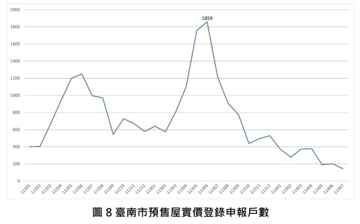 進一步觀察各行政區交易量表現,交易量前三名分別為安南區(308棟)、安平區(267棟)以及永康區(142棟)。與去年同期相比,安平區增幅最為顯著,本期交易量增加26.54%,其中安平區因區內新建案陸續完工後,第一次移轉登記的案量較去年同期大幅增加,本期第一次移轉棟數為200棟。相比之下,佳里區、永康區以及南區交易量皆下跌逾5成。再觀察本市預售屋實價登錄申報件數113年7月起已呈現逐步下修量縮態勢,本期與去年同期(113年7月)相比下降88%。後續仍需關注政策走向及國際經濟情勢的變化,將成為買方進場意願及資金流動的關鍵影響因子。