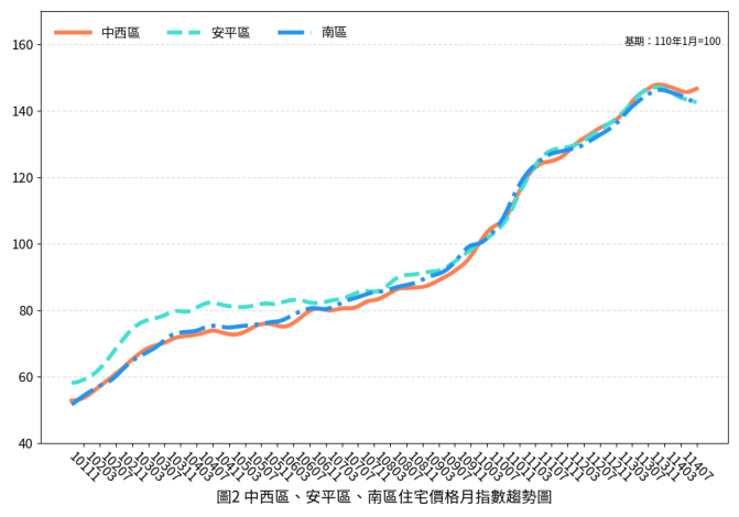 整體而言,本期臺南住宅市場進入價量齊跌整理格局。各行政區因重大開發計畫推進與新建案完工時程不同,房價表現漲跌互見。全國景氣指標仍屬穩定態勢未來市場走向仍面臨諸多不確定因素,購屋者宜審慎評估風險,保守因應。有關詳細住宅價格指數資訊,將公佈於本府地政局網站。