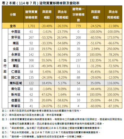 地政局局長陳淑美表示,114年7月國內經濟景氣信號分數為29分,與上月持平,燈號續呈綠燈,各構成項目分數均維持不變。另領先指標續為下滑,同時指標維持上升,顯示當前國內景氣續穩定,但須密切關注後續變化。本期住宅價格指數多數行政區持續微幅下跌修正。而交易量方面,全市7月建物移轉棟數共計1,701棟,較前期(6月)減少20.48%,整體買賣棟數與去年同期(113年7月)相較大幅衰退26.55%,觀察結果顯示,住宅成屋市場成交量能縮減,市場氛圍傾向謹慎。