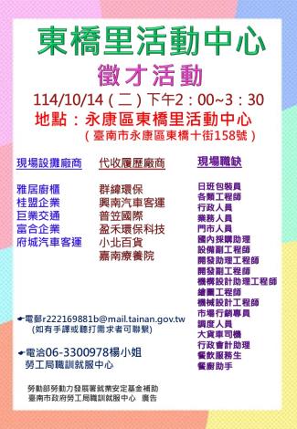 114/10/14(二)勞工局職訓就服中心辦理永康區東橋里活動中心廠商聯合徵才活動 歡迎求職民眾踴躍參加