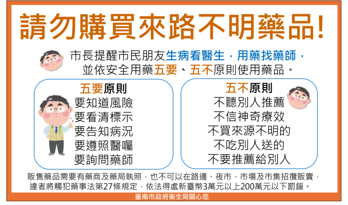 衛生局長李翠鳳提醒市民生病看醫生,用藥找藥師,並遵循專業醫藥人員的指示使用領有我國藥品許可證之藥品才能確保自身的健康和用藥安全。落實安全用藥「五要」、「五不」原則,「五要」原則:要知道風險、要看清標示、要告知病況、要遵照醫囑、要詢問藥師。「五不」原則:不聽別人推薦、不信神奇療效、不買網路、地攤夜市或來源不明的、不吃別人送的、更不要推薦給別人。