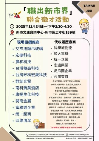 為打造黃偉哲市長「希望家園」的施政願景,勞工局積極辦理各項就業徵才活動,並因應產業求才需求,勞工局職訓就服中心將於11月21日(五)14時30分至16時在仁德里活動中心(仁德區文心路138)辦理『頭路 ...更多
