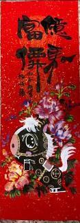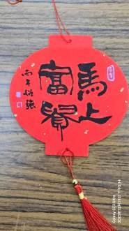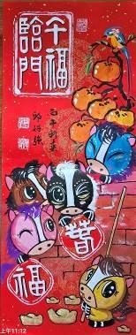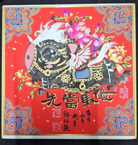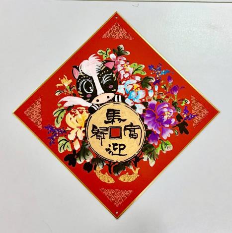 秘書處表示,展場中兩件作品引人注目。第一件作品《馬迎富貴》,採小春聯菱形構圖,中央為金色圓形古錢幣,四周環繞迎春花卉,一隻黑白相間的Q版可愛馬從花叢中探出,粉嫩的耳朵與大眼睛格外討喜,寓意馬上富貴圓滿。第二件作品《馬到成功》,Q版馬臉龐圓潤,頭上還有一撮俏皮馬鬃,身穿金色紋飾的盔甲戰袍,將駿馬的英勇形象與Q版萌系風格完美結合,既威風又討喜;圖下方古錢幣書寫進寶、吉祥、平安、有財,展現出丙午馬年的威武氣勢及新年喜氣。兩件作品皆巧妙融合傳統節慶元素與現代可愛美學,既有文化底蘊又充滿童趣,展現出春聯藝術的無限可能。