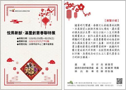 「悅馬新猷·湛墨創意春聯特展」即日起至2月25日於永華中心二樓中庭展出,每週一至週五上午9點至下午5點開放參觀。誠摯邀請藝文愛好者及關心傳統文化朋友蒞臨指導,共同感受傳統春聯文化魅力,見證書法藝術的創新與傳承,讓這份珍貴的年味記憶在新世代中繼續飄香。