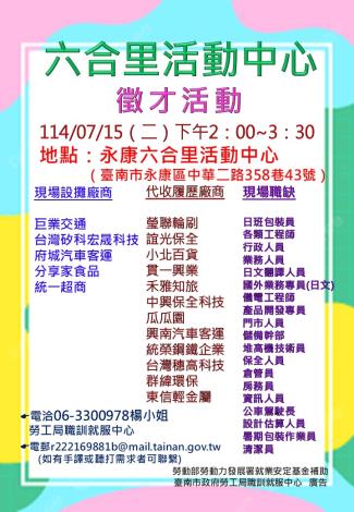 為打造黃偉哲市長「希望家園」的施政願景,勞工局積極辦理各項就業徵才活動,並因應產業求才需求,勞工局職訓就服中心將於114年07月15日(週二)下午2時至3時30分在永康區六合里活動中心(臺南市永康區中華二路358巷43號)辦理廠商聯合徵才活動,邀請17家廠商提供488個職缺,歡迎求職民眾踴躍前往參加,洽詢電話:06-3300978。