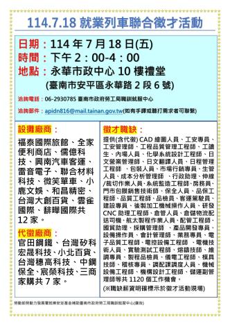 為打造黃偉哲市長「希望家園」的施政願景,勞工局積極辦理各項就業徵才活動,並因應產業求才需求,勞工局職訓就服中心將於114年7月18日(週五)下午2時至4時在永華市政中心10樓禮堂(臺南市安平區永華路2段6號)辦理「114.7.18就業列車聯合徵才活動」,邀請19廠商提供1120個職缺,歡迎求職民眾踴躍前往參加,洽詢電話:06-2930785。