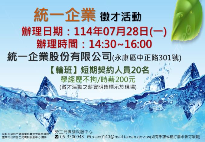 為打造黃偉哲市長「希望家園」的施政願景,勞工局積極辦理各項就業徵才活動,並因應產業求才需求,勞工局職訓就服中心將於07月28日(週一)14時30分至16時在統一企業股份有限公司(永康區中正路301號)辦理『統一企業股份有限公司』徵才活動,提供20個職缺,歡迎求職民眾踴躍前往參加,洽詢電話:06-3300948。
