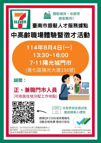 為打造黃偉哲市長「希望家園」的施政願景,勞工局積極辦理各項就業徵才活動,並因應產業求才需求,臺南市銀髮人才服務據點將於8月4日 (星期一) 13時30分至16時舉辦單一徵才暨職場體驗活動,地點於7-11陽光城門市(臺南市善化區陽光大道198號),提供40個職缺,讓求職者至企業了解職場環境、職務內容與工作體驗實作,並安排現場面試媒合就業,提供企業與求職者面對面徵才管道,歡迎55歲以上有求職意願者、已退休欲二度就業者踴躍報名參加(https://reurl.cc/NxXMRp),洽詢電話:06-5832516。