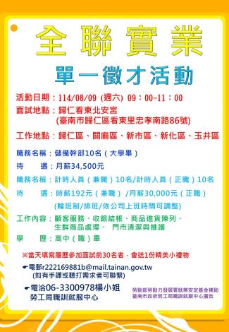 為打造黃偉哲市長「希望家園」的施政願景,勞工局積極辦理各項就業徵才活動,並因應產業求才需求,勞工局職訓就服中心將於08月09日(六)9時至11時在歸仁看東北安宮(臺南市歸仁區看東里忠孝南路86號) 辦理『全聯實業股份有限公司』單一徵才活動,提供30個職缺,歡迎求職民眾踴躍前往參加,洽詢電話:06-3300978。