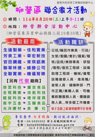 為打造黃偉哲市長「希望家園」的施政願景,勞工局積極辦理各項就業徵才活動,並因應產業求才需求,勞工局職訓就服中心將於8月20日(週三)上午9時至11時在柳營聯合活動中心(柳營區東昇里中山西路二段19巷35號)辦理聯合徵才活動,邀請20家廠商提供342個職缺,歡迎求職民眾踴躍前往參加,洽詢電話:06-6990370/6990302。