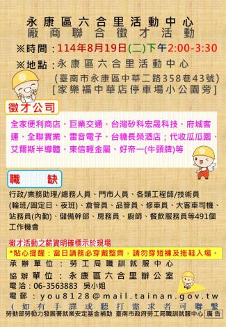 為打造黃偉哲市長「希望家園」的施政願景,勞工局積極辦理各項就業徵才活動,並因應產業求才需求,勞工局職訓就服中心將於8月19日(週二)下午2時至3時30分在永康區六合里活動中心(臺南市永康區中華二路358巷43號)辦理廠商聯合徵才活動,邀請11家廠商提供491個職缺,歡迎求職民眾踴躍前往參加,洽詢電話:06-3563883。
