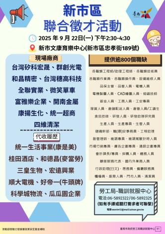 為打造黃偉哲市長「希望家園」的施政願景,勞工局積極辦理各項就業徵才活動,並因應產業求才需求,勞工局職訓就服中心將於09月22日(一)14時30分至16時30分在新市區文康育樂中心(新市區忠孝街189號)辦理新市區聯合徵才活動,邀請20家廠商提供逾800個職缺,歡迎求職民眾踴躍前往參加,洽詢電話:06-5892322。