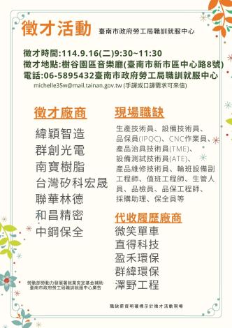 本次徵才活動邀請緯穎智造、群創光電、南寶樹脂、台灣矽科宏晟、聯華林德、和昌精密、中鋼保全等7家設攤廠商,另外還有微笑單車、直得科技、盈禾環保、群緯環保、澤野工程等5家代徵廠商,當日設攤職缺:生產技術員、設備技術員、品保員(IPQC)、CNC作業員、產品治具技術員(TME)、設備測試技術員(ATE)、產品維修技術員、輪班設備副工程師、值班工程師、生管人員、品檢員、品保工程師、採購助理、保全員等超過300個工作機會。其中因應科技業需求提供30個職缺,歡迎意者於活動當日親洽現場投遞履歷參加面試,活動職缺之薪資明確標示於徵才現場。