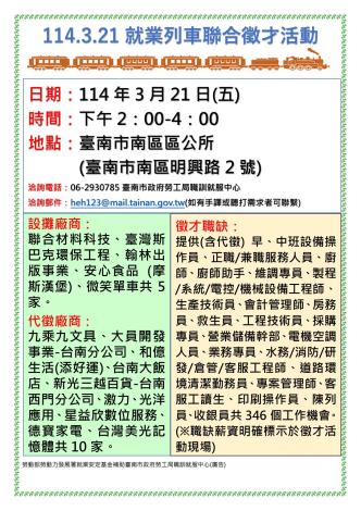 為打造黃偉哲市長「希望家園」的施政願景,勞工局積極辦理各項就業徵才活動,並因應產業求才需求,勞工局職訓就服中心將於114年3月21日(週五)下午2時至4時在臺南市南區區公所(臺南市南區明興路2號)辦理「114.3.21就業列車聯合徵才活動」,邀請15家廠商提供346個職缺,歡迎求職民眾踴躍前往參加,洽詢電話:06-2930785。