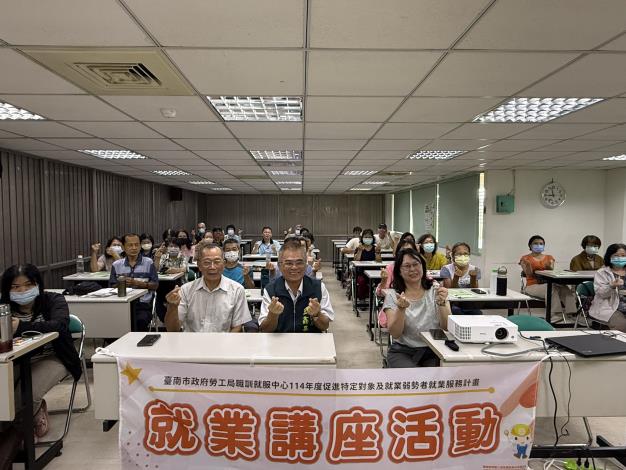 為落實黃偉哲市長「希望家園」施政理念,臺南市政府勞工局今年針對中高齡、二度就業婦女、低收入戶及中低收入戶等特定對象辦理6場次「促進特定對象就業講座」,期盼透過講座協助民眾調整求職心態、提前做好準備,同時也安排就服員到場為學員說明就業服務資源運用,希望透過課程能協助學員規劃未來職涯,尋找適性工作,順利投入職場穩定就業。本年度首場講座以中高齡求職者為主要對象,今(1)日於南門勞工育樂中心辦理,吸引多位學員參與。