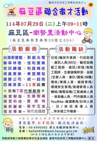 為打造黃偉哲市長「希望家園」的施政願景,勞工局積極辦理各項就業徵才活動,並因應產業求才需求,勞工局職訓就服中心將於7月29日(週二)上午9時至11時在南勢里活動中心(麻豆區南勢里南勢36號之204)辦理聯合徵才活動,邀請18家廠商提供513個職缺,歡迎求職民眾踴躍前往參加,洽詢電話:06-6990370/6990302。