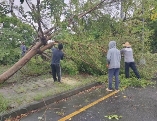 丹娜絲颱風重創臺南工業區,市府第一時間即啟動「緊急通報及災害排除復原機制」,並全面盤點災損。各園區合計倒塌路樹逾1,100棵,期間各服務中心獲報後立即派保全人員趕抵現場設置警示標誌並回報災點位置,經發局隨即依契約要求廠商24小時內完成道路障礙清除,確保道路暢通。復原作業依序推動道路暢通、水電供應、設施修復與環境清理,並同步清除積水,降低登革熱風險,展現高效災後復原能力。
