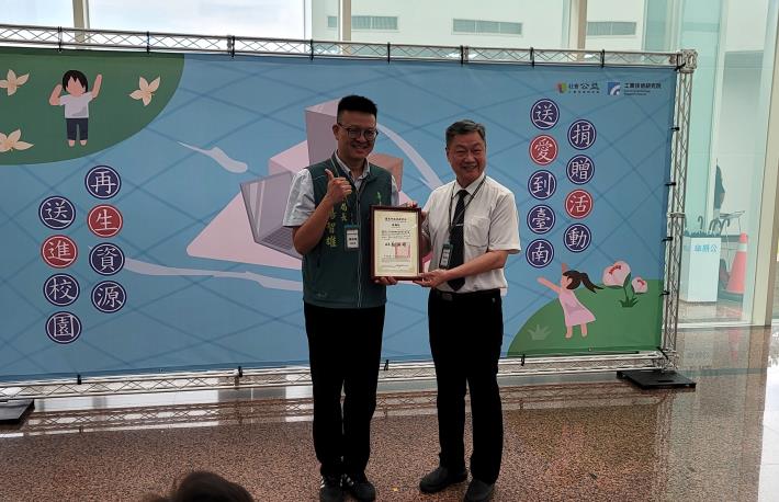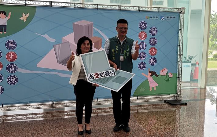 為協助受丹娜絲風災影響受災學校學生安心就學,工業技術研究院秉持「科技有溫度、公益無距離」精神攜手慈濟基金會捐贈南市受災學校學生再生筆電、閱讀圖書及二手辦公家具,今日(17)日下午於工研院南創院區舉辦「送愛到臺南—臺南風災區國中小捐贈活動」,由教育局楊副局長智雄代表市政府向工研院及慈濟基金會致贈感謝狀,與學校代表共同見證愛心義舉。