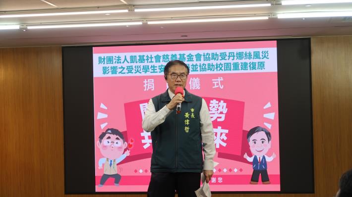 臺南市長黃偉哲表示,丹娜絲颱風重創中南部,造成嚴重災情與損失,不僅影響民眾生活,也對孩童的就學與心理造成衝擊。在重建的路上,需要政府與民間力量攜手,感謝財團法人凱基社會慈善基金會長期耕耘地方公益,秉持助人為樂的信念,在災後第一時間伸出援手,發揮高度的社會責任感。黃市長強調,這筆物資不僅是經濟上的協助,更是希望與溫暖的鼓勵,希望能幫助孩子們在逆境中堅強成長,勇敢迎向未來。也呼籲更多企業與團體響應善舉,齊心為需要幫助的家庭築起更穩固的保護網。