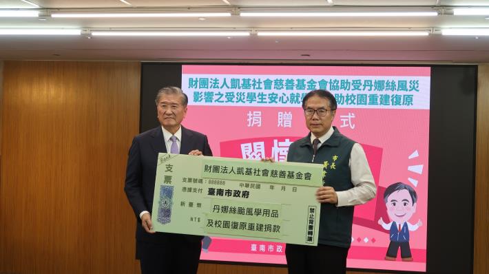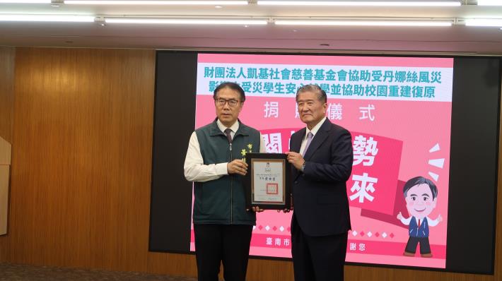 財團法人凱基社會慈善基金會關懷受丹娜絲颱風影響的學童,捐贈學用品協助受災學生及家庭度過生活難關,總發放金額達37萬餘元,共有36校176名學生受惠;並捐贈275萬餘元協助5所學校校園重建復原,總捐贈金額達新臺幣312萬餘元。捐贈表揚儀式今(25)日在臺南市政府永華市政中心舉辦,由市長黃偉哲頒發感謝狀予該基金會執行長曾錦隆。