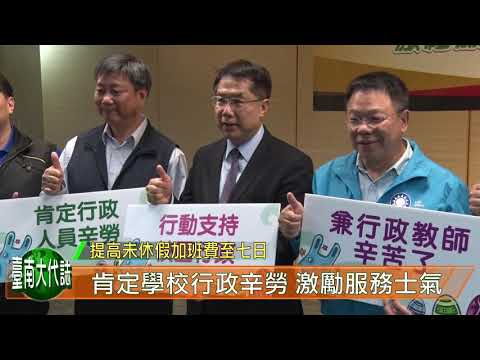 台南市為了落實保障教師權益,2月12日由市長黃偉哲宣布,將學校行政人員未休假加班費由3日提高至7日,讓學校兼任行政人員的教師未休假加班費日數與本市公務人員相同。 黃市長表示,把教育人員當中兼行政工作的同仁的不休假獎金從3天提升到7天,對於向來經費不很充裕的台南市來講是蠻大的一步,基本上會受益的教育行政工作者大概有4千多位,所需的金額達3千多萬。黃市長也希望在學期剛開始,藉著對教育行政工作者小小的獎勵,能夠幫忙校務治理更有效率,也維護學童的受教權。