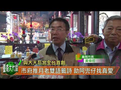 農曆春節後緊接著2月14日就是西洋情人節,有別於鮮花、禮物與大餐等慶祝模式,台南創全國之先,於情人節前夕推出「月老雙語籤詩」,台南市長黃偉哲特別為前來體驗的外籍朋友英語導覽解說,並且陪同外籍朋友鑽轎腳、執筊求月老靈籤以及DIY平安符等,讓參與的外國人大呼「超酷」。 黃市長表示,其實台南第二官方語已經實施一些日子了,並以國外lucky cookies當中的小籤詩為例,表示既然國外有這樣的產品,如果外國朋友來台南,到廟裡拜拜,看到抽籤也想試一試,可是抽到的籤都是中文,一方面看不懂,另一方面不會解籤詩,如果提供雙語的籤詩,讓外國的朋友看得懂其實滿好的。
