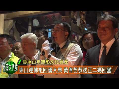 國家重要民俗「東山碧軒寺迎佛祖暨遶境」,農曆年前碧軒寺「正二媽」觀音佛祖回關子嶺火山碧雲寺祖家過年,2月13日(即農曆正月初九)日午夜時分舉行回駕大典,在台南市長黃偉哲及台南市議會議長郭信良等貴賓向佛祖參拜、行獻禮後,觀音佛祖在眾多宮廟及信眾護送下起駕返回碧軒寺,沿古香路由深夜走到白天,返回東山後進行遶境祈福活動。 黃市長昨日代表台南市各界前來恭送「正二媽」觀音佛祖,他相信一起參與東山迎佛祖的好朋友們,必定都能受到佛祖加持保佑、闔家平安。黃市長更進一步表示,東山迎佛祖活動不僅是宗教活動,同時也是國家重要無形民俗文化資產,每年定時定期舉行,且整場儀式過程不因時代變遷及工業化而改變,在延續地方信仰、發揚民俗文化上意義重大。黃市長除了親自恭送觀音佛祖登轎安座、起駕回鑾外,也祈求觀音佛祖大發神威、大展神風,保佑台灣在新的一年,國泰民安、風調雨順,每一個縣市都平平安安、順順利利,安居樂業。