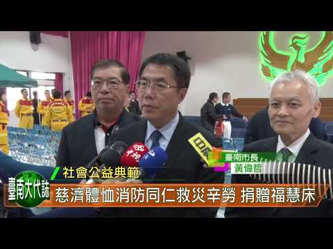 為讓救災搶險人員在執行勤務時,能有妥適的裝備休整。1月25日下午在消防局7樓禮堂辦理「淨斯多功能福慧床」捐贈儀式。會中由佛教慈濟慈善事業基金會顏博文執行長代表捐贈,黃偉哲市長代表市府受贈並頒發感謝狀。市長表示,感謝慈濟基金會拋磚引玉,體恤消防人員的辛苦,捐贈60組「淨斯多功能福慧床」,除加強本市救災裝備外,也讓搶險現場的特搜人員能獲得充份的休息,強化災害搶救的效能。