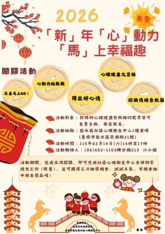 「2026臺南行春」一站掌握逾百項活動與吃喝玩樂 為便利民眾規劃春節與元宵連假旅遊行程,臺南市政府觀光旅遊局彙整逾百項春節活動,建置「2026臺南行春」網站,整合春節及元宵期間全市重要展覽、演藝、活動、花海、導覽活動、燈會、交通等資訊,並串聯交通局即時交通資訊網,同時彙整民政局提供的各區重要代表寺廟及相關年節活動,讓民眾一站掌握臺南過年期間最完整、最即時的旅遊與走春資訊,輕鬆安排豐富又安心的新春行程。