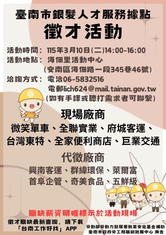 為打造黃偉哲市長「希望家園」的施政願景,勞工局積極辦理各項就業徵才活動,並因應產業求才需求,勞工局職訓就服中心將於3月6日(週五)上午9點30分至11點30分在樹谷園區音樂廳辦理小型徵才活動(臺南市新 ...更多