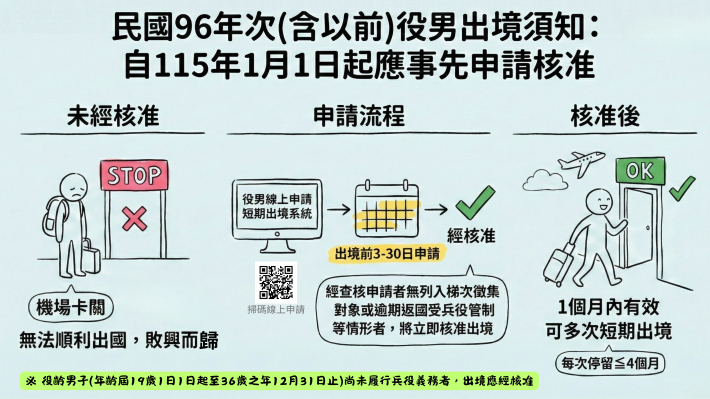 春節等連續假期即將來臨,臺南市政府提醒民國96年次(含以前年次)出生的男子,如果要出境,應事先經申請核准。 副市長姜淋煌代理民政局局長表示,有鑑於民國96年次出生 ...更多