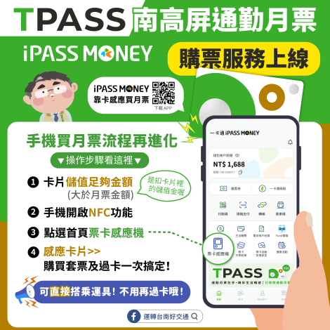Attention all Tainan commuters with a TPASS! We have a new purchase channel for the monthly plan thanks to the Tainan City Government Bureau of Transportation and the iPASS company. Commuters with an NFC-supported mobile phone can now download the iPASS MONEY app and purchase the monthly plan by directly tapping the physical TPASS card on the phone. Users can also activate the card or cancel tickets via the app, saving handling fees and a trip to the physical locations.
