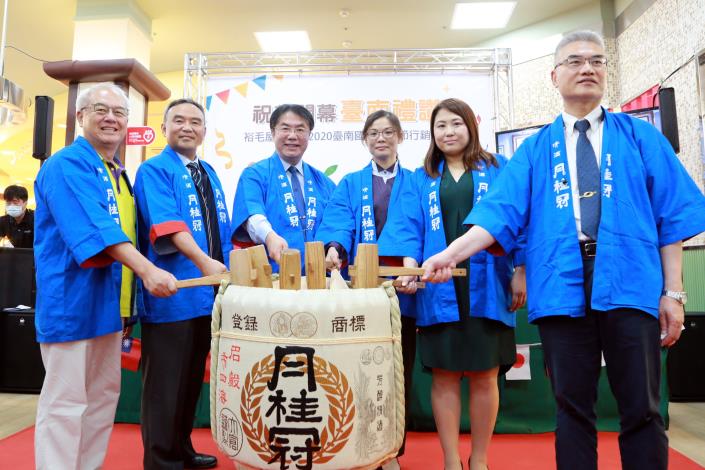 台中市政府副秘書長陳如昌、農糧署南區分署副組長黃瑞呈、日本茨城縣笠間市交流事務所(駐台辦事處)處長木下知香及裕毛屋董事長謝明達等各界貴賓共襄盛舉,一同參與鏡開祈福儀式,透過敲開清酒桶,期盼迎來銷售佳績。