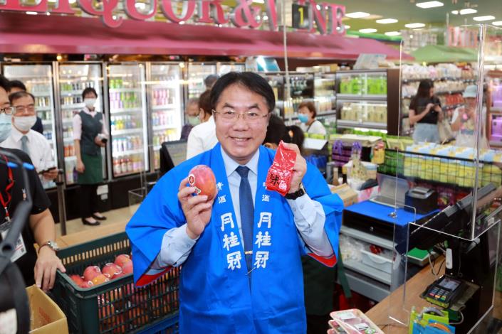 台南芒果正值盛產旺季,台南市長黃偉哲再次化身超級行銷達人,配合裕毛屋台中公益店於今(20)日重新開幕,黃偉哲市長率農業局長謝耀清、農會總幹事及業者,帶著當季鮮甜的芒果及各區特色優質農特產品上架裕毛屋超市,熱情歡迎台中市民朋友購買優質台南農特產,黃市長並祝賀裕毛屋銷售長紅。