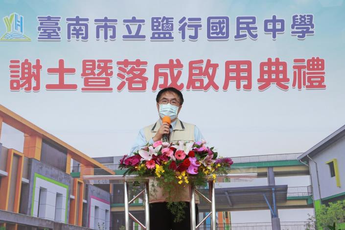台南市政府為讓永康鹽行地區孩子能夠就近入學,減少橫越交通要道的危險性,經地方民代及政府單位積極努力下,投入約3.3億元設立鹽行國中,自107年10月動工,歷時近3年,於今(26)日舉行新校落成典禮,市長黃偉哲與副總統賴清德及各界貴賓到場見證這歷史性的一刻,黃偉哲勉勵學校持續精進教育,引領孩子走向更燦爛輝煌的未來。