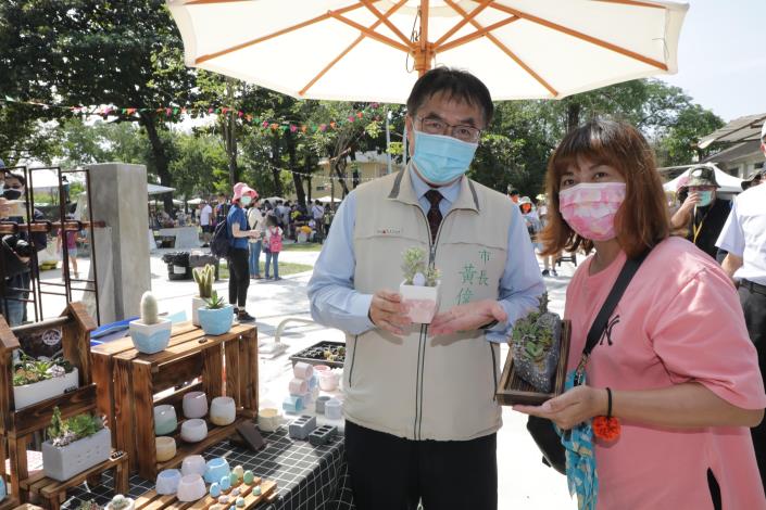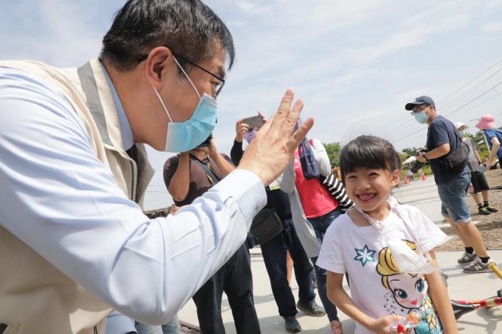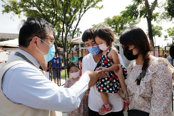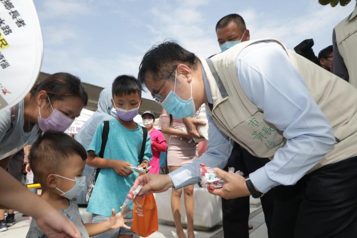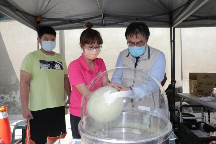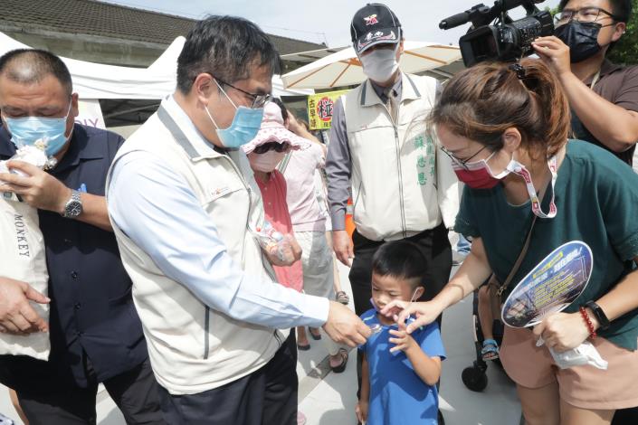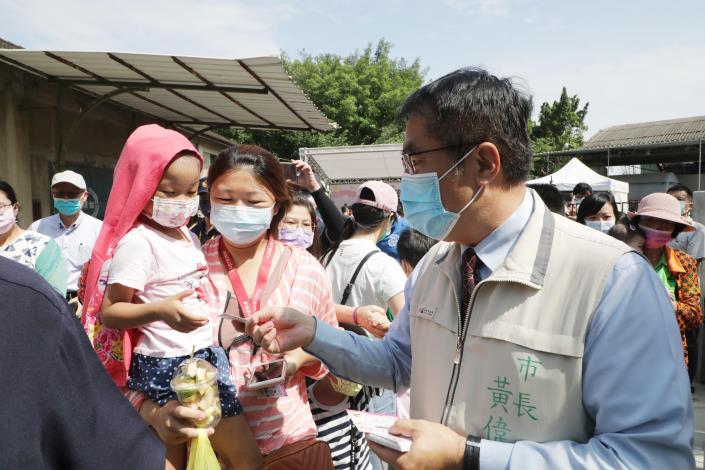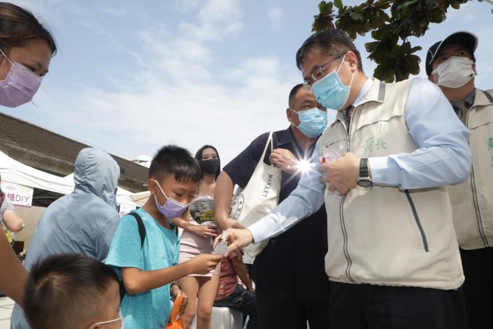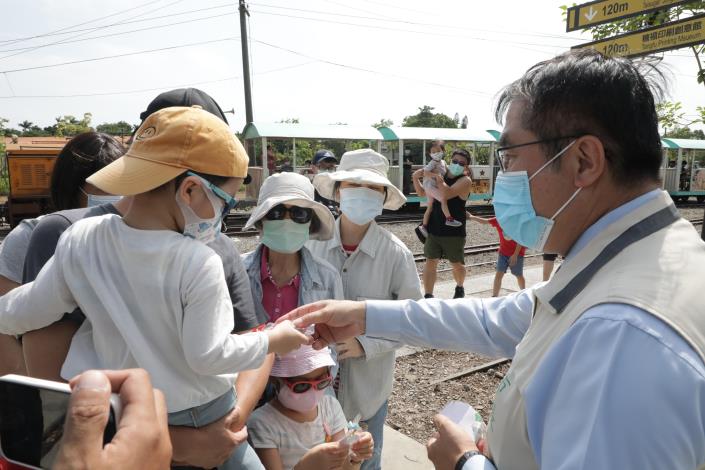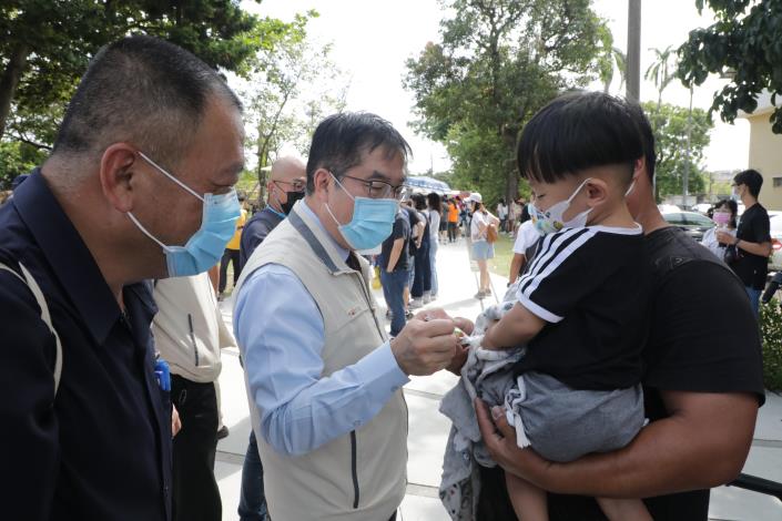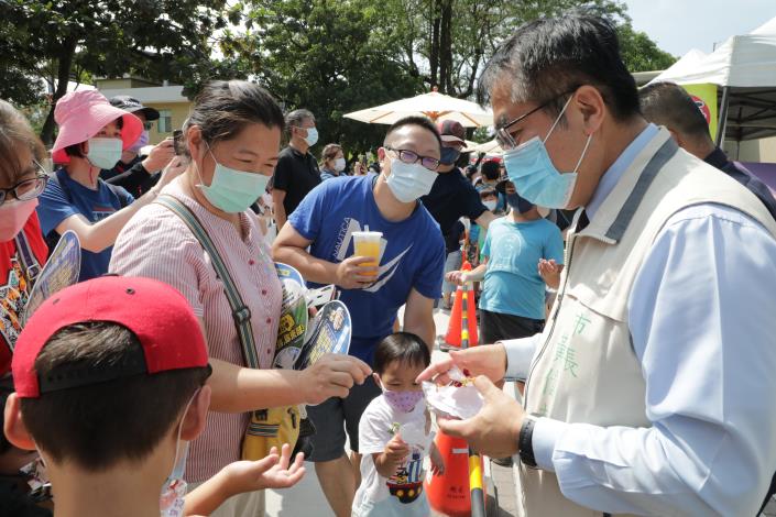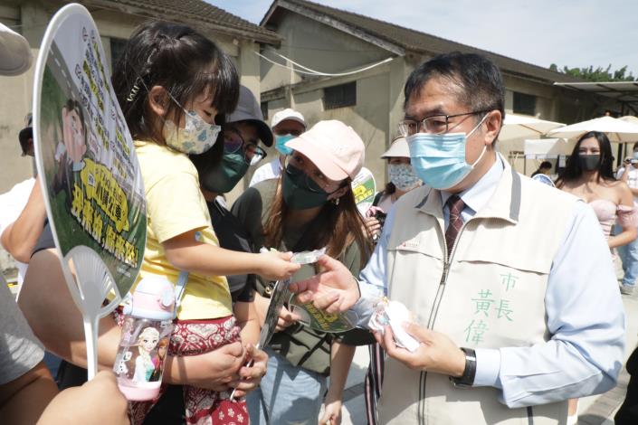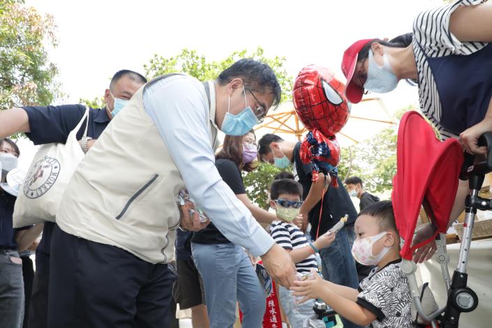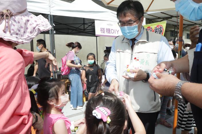 「2021新營甜蜜節」活動這個週末在適合漫步遊憩的新營糖廠鐵道文化園區登場,兩天吸引逾萬人次參加,不少家長趁著天氣晴朗,在疫情趨緩後帶著小朋友出遊,品嚐糖品甜蜜滋味、享受假日悠閒時光。台南市長黃偉哲今(17)日中午再度前往發放冰棒兌換券與大小朋友熱絡互動,繼體驗昨(16)日的椪糖DIY後,他今日也試著製作棉花糖,十足展現甜蜜節呷甜蜜的樂趣。