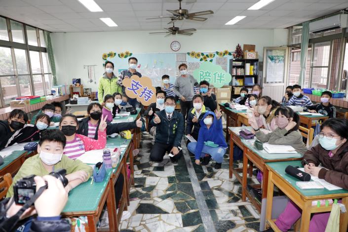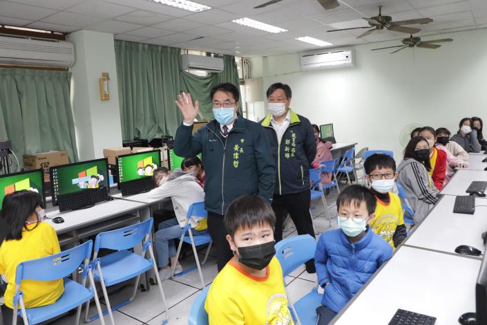 日前因台南市某私校有確診者足跡,影響部分學生被匡列集中隔離,無法如期到校實體上課,台南市長黃偉哲指示教育局,將平板電腦與無線網卡等物品借用給每位隔離學生,今(15)日親自前往國小入班訪視,關心學生同步視訊上課情形,也入鏡與集中隔離學童親切互動,給隔離學生加油打氣。