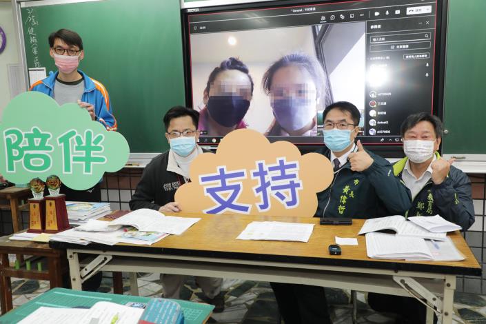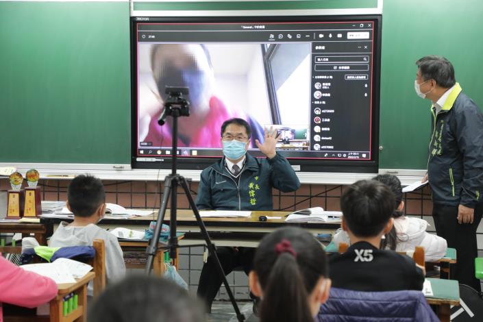 市長黃偉哲表示,上週五(11日)有45名國小學童被匡列進行集中隔離,為了讓這些學童未能到校也可安心學習,並與同班同學互動,南市府教育局立即啟動停課不停學、線上同步遠距視訊教學的機制。今日實際到國小入班訪視,看到被隔離學生也和班上同學同步上課,可以一起學習、互相陪伴打氣,感到很欣慰,也十分感謝學校和老師們的用心。