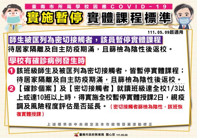 因應教育部5月3日新修正「校園因應COVID-19疫情暫停實體課程實施標準」,以確診個案之密切接觸者及其篩檢結果做為判斷停課範圍,臺南市COVID-19一級指揮中心昨(5)日通過教育局提案,為兼顧校園防疫、學習品質,並減少預防性全班停課對家長之衝擊,新修正南市校園暫停實體課程標準,並於今(6)日防疫記者會正式宣布5月9日起實施。
